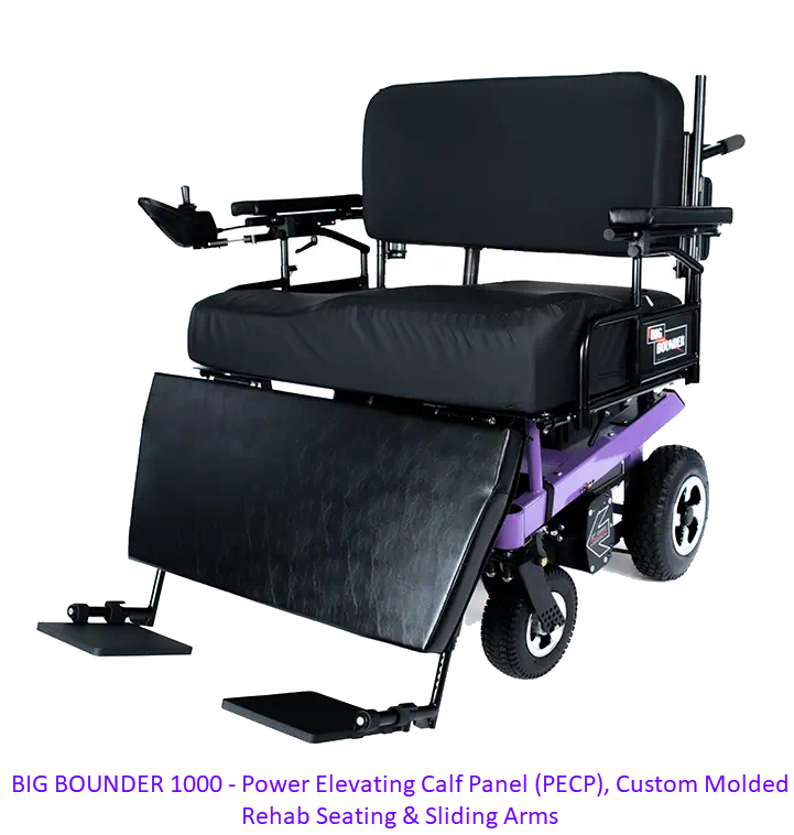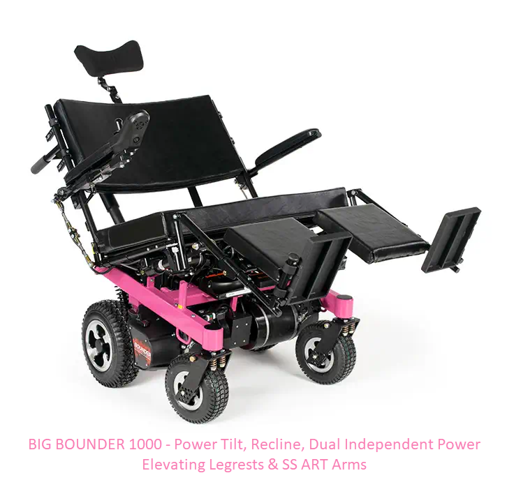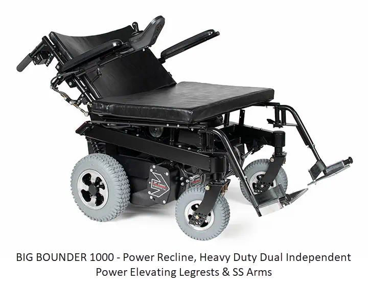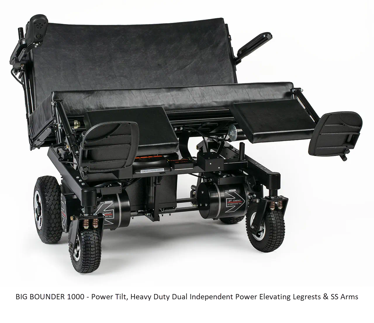 The Big Bounder Bariatric Rear Wheel Drive Power Wheelchair offers full scriptability to meet the most complex bariatric mobility requirements. Available in 272 kg (BB-600) and 450 kg (BB-1000) safe working loads, it combines a stable rear-wheel drive platform with precision engineering for superior performance in all conditions. Clinicians can customise every detail — seat dimensions, postural supports, control systems (R-net or LiNX), suspension, and power positioning — to achieve an optimal fit and function for each client. With a TIG-welded steel frame, heavy-duty adjustable suspension forks, and quiet, high-torque motors, the Big Bounder is designed for durability, stability, and comfort in both home and community settings.