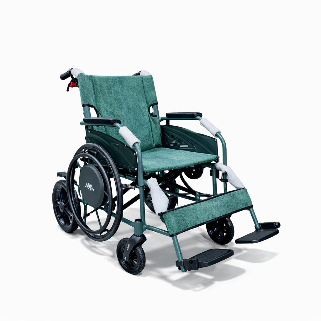 The compact wheel size keeps the overall chair nimble and easy to manoeuvre, particularly indoors and in tighter community environments. Upholstered seating and backrest panels add comfort, while the sturdy frame and practical layout make this chair suitable for everyday use.