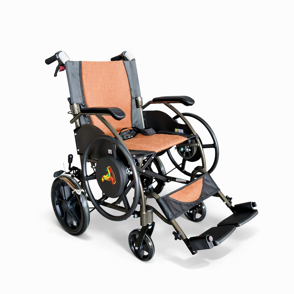 This belt drive manual wheelchair is designed to improve propulsion comfort and efficiency while maintaining a compact, practical footprint. Instead of traditional push rims, the chair uses small 12-inch rear wheels driven by a hand-operated drive wheel connected via a belt system.