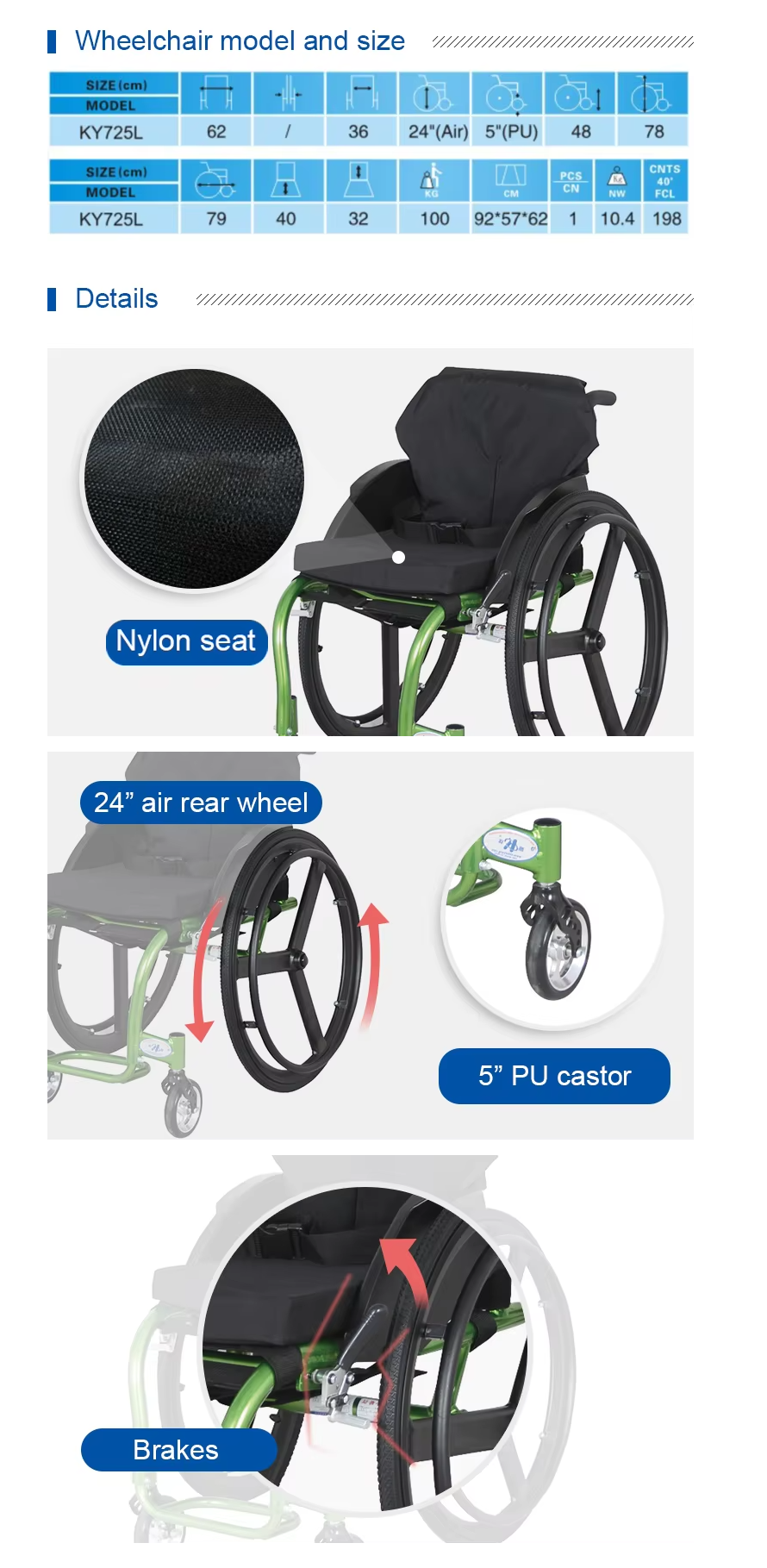 Designed with detachable rear wheels, the KY725L-36 is easy to transport and store, making it well suited to outings, travel, and active community use. Its responsive handling and lightweight construction support confident self-propulsion, while the sleek design gives it a contemporary, fashion-forward look compared to traditional manual wheelchairs.