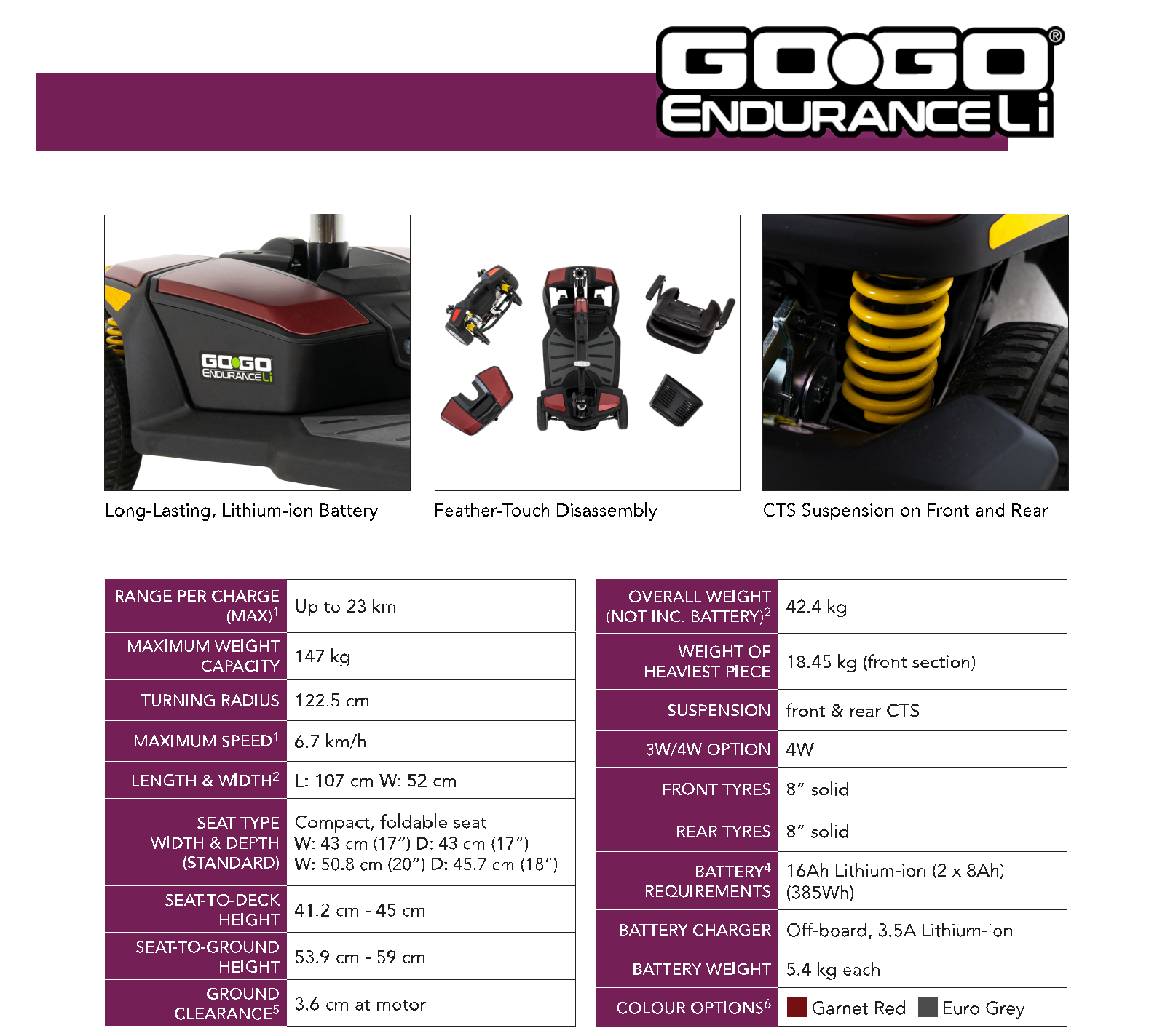 Powered by an advanced lithium-ion battery, the Go Go Endurance Li delivers an impressive range of up to 23km on a single charge, so you can go farther without worry. Whether you're running errands, exploring new places, or navigating airports, this travel-friendly scooter offers the independence you need with the reliability you deserve.