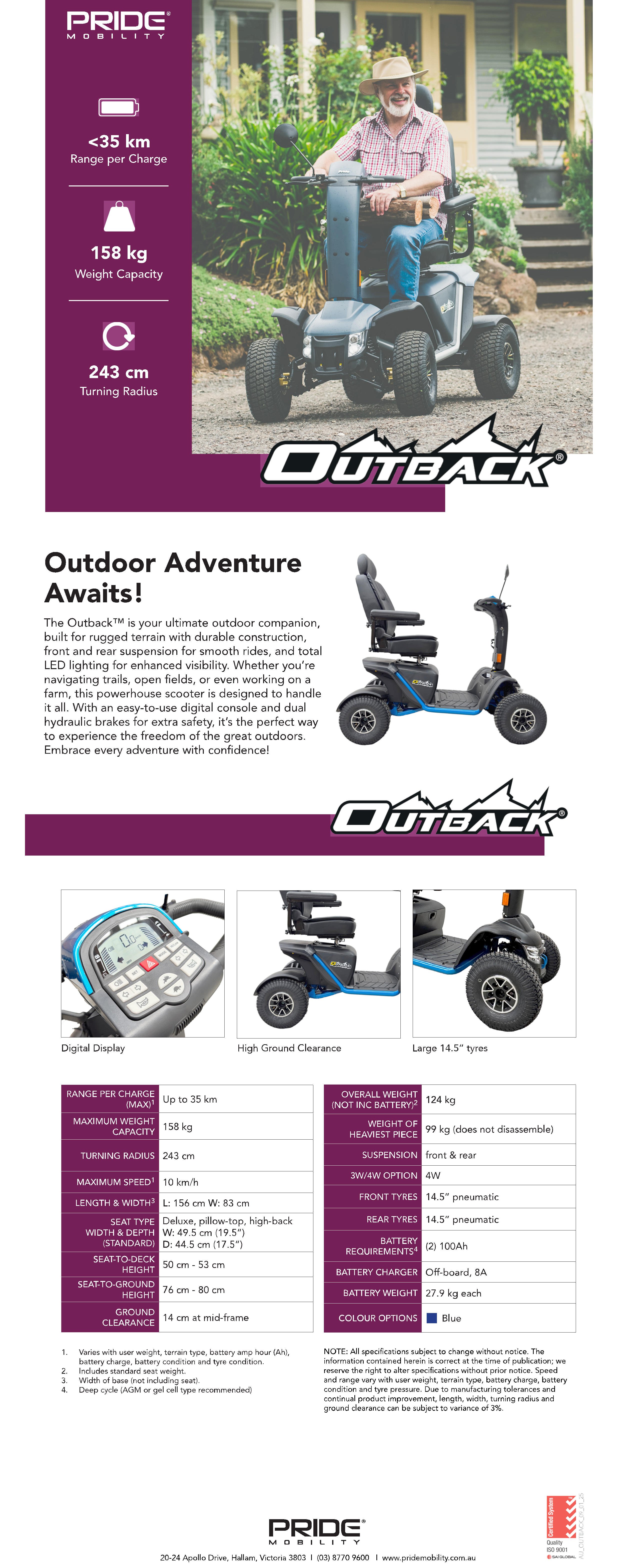 The Outback™ is your ultimate outdoor companion, built for rugged terrain with durable construction, front and rear suspension for smooth rides, and total LED lighting for enhanced visibility. Whether you’re navigating trails, open fields, or even working on a farm, this powerhouse scooter is designed to handle it all. With an easy-to-use digital console and dual hydraulic brakes for extra safety, it’s the perfect way to experience the freedom of the great outdoors. Embrace every adventure with confidence!